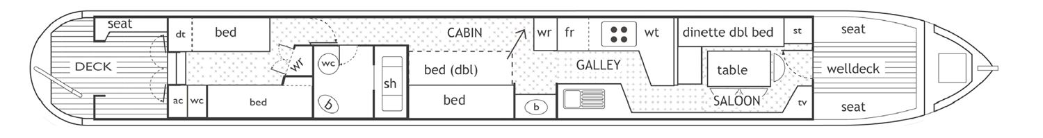 Brendon is a stunning semi-traditional narrow boat with more than enough room for 6 people. There is the potential to turn one of the single beds into a set of bunk beds for younger children, making it an ideal family holiday boat. Brendon comes with a large front and back deck, both with seating. A table can be added at the front making it perfect for sitting out and soaking up the sun’s rays, having a drink or relaxing with a book. Brendon is built with an inviting and welcoming feel thanks to the large saloon and outdoor space, making her ideal for spending quality time with loved ones. Brendon is also well equipped with a cooker, fridge, television dvd player, radio/ CD player and a spacious bathroom, making your stay comfortable and enjoyable.