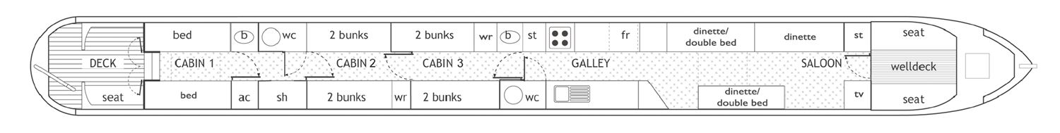 Pennine is one of two 12 berth boats, with plenty of room for everyone. The semi-traditional design gives the boat an inviting atmosphere, and the windows create an open feel and provide the opportunity for stunning views. The spacious saloon provides a great place to socialise and relax, likewise, the large seated front and back decks add to the communal areas making Pennine ideal for spending quality time with loved ones. The large well-equipped kitchen with oven and fridge with ice box, provides the opportunity for everyone to sit together and enjoy a meal.